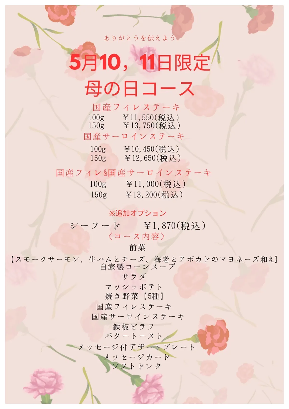 5月10日(土)、11日(日)限定の「母の日コース」をご用意しました。